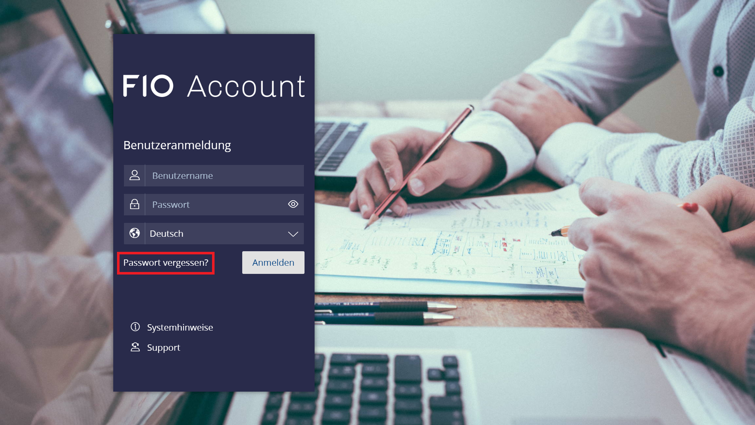 Klicken Sie dazu auf den Link Passwort vergessen? auf der Seite für die Benutzer-Anmeldung zu FIO ACCOUNT.