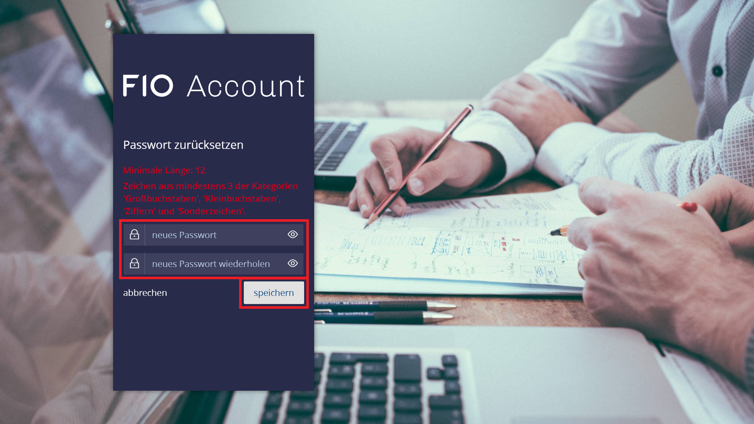 Betätigen Sie den Button speichern, um Ihre Eingabe zu bestätigen. Ihr Passwort wurde nun zurückgesetzt und Sie können sich jetzt mit diesem an FIO ACCOUNT anmelden.