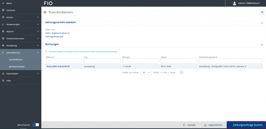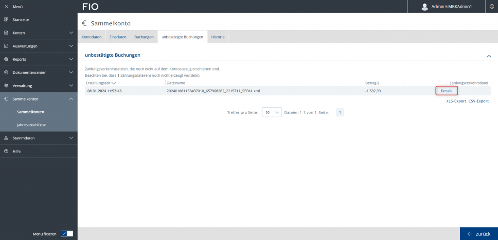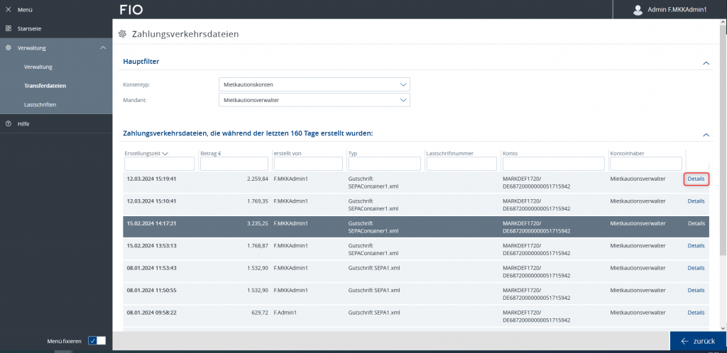 Sie sehen nun eine Übersicht über alle beauftragten Zahlungsverkehrsdateien. Zahlungsverkehrsvorgänge für die noch keine Zahlungsverkehrsdatei erzeugt wurde, können direkt am virtuellen Konto, im Karteireiter Abrechnung mit dem Link löschen gelöscht werden. Um eine Zahlungsverkehrsdatei erneut zu versenden, wählen Sie bitte den Link Details.