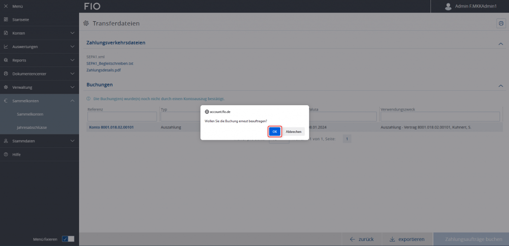 Es ist möglich eine in FIO ACCOUNT beauftragte und somit an den Bankrechner versendete Zahlungsverkehrsdateien erneut zu beauftragen.