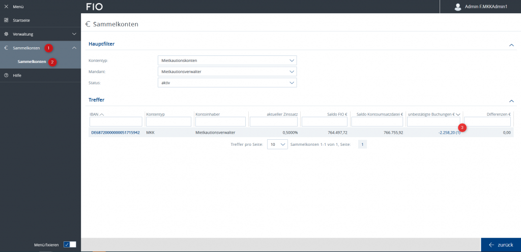 - Suchen Sie das gewünschte Sammelkonto in der Liste der Sammelkonten und betätigen Sie den Link über den Betrag der unbestätigten Buchungen